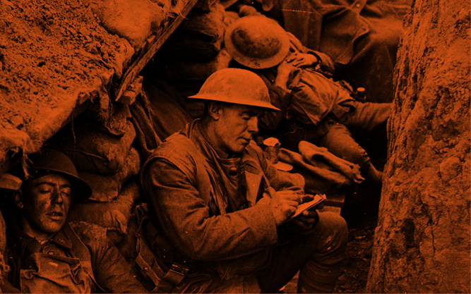 Vier kanadische Soldaten schlafen und schreiben Briefe in den Schützengräben bei Willerval. Die Nacht war in den Schützengräben oft eine geschäftige Zeit: Drahtverlegungs-, Arbeits- und Überfallkommandos wurden alle nachts ausgesandt. Der Tag war daher die Zeit der Entspannung und des Versuchs, ein wenig Schlaf zu finden. Foto: Rider-Rider, W (Lt), offizieller kanadischer Fotograf, (01.04.1918), Imperial War Museum, Lizenz-Nr. LIC-02866-J8G3S6